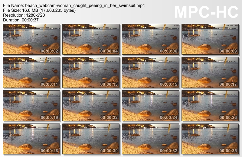 A lucky spot on a public beach webcam where a young woman walking along pauses to empty her bladder through her swimsuit, leaving a lovely wet patch on the rock behind her.