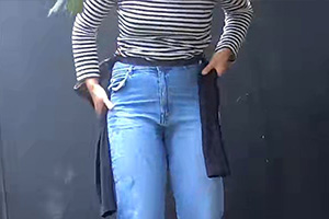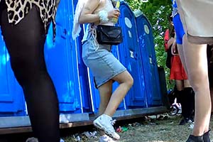 Sexy Denim Skirt Pee Dance While Waiting For A Porta Potty